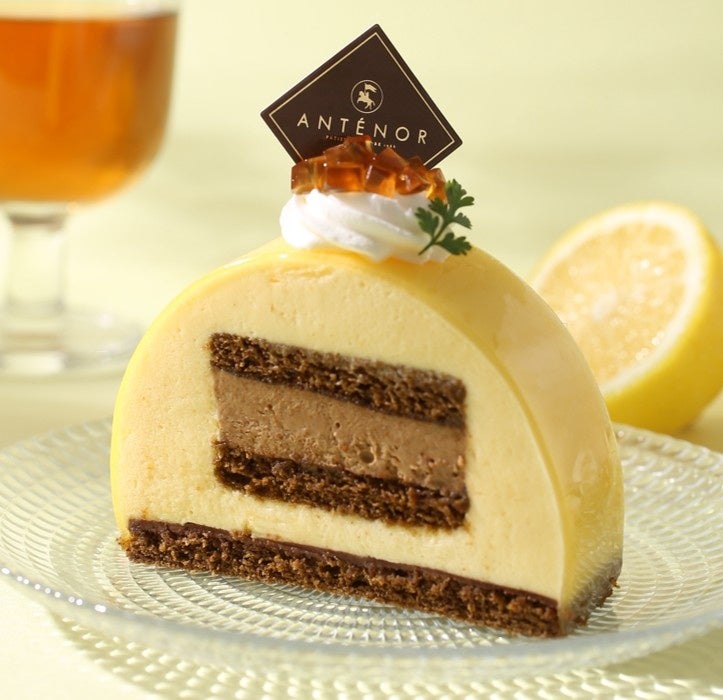 紅茶のアーモンドスポンジでアールグレイ香るショコラムースをサンドし、レモンとはちみつのムースで包みました。