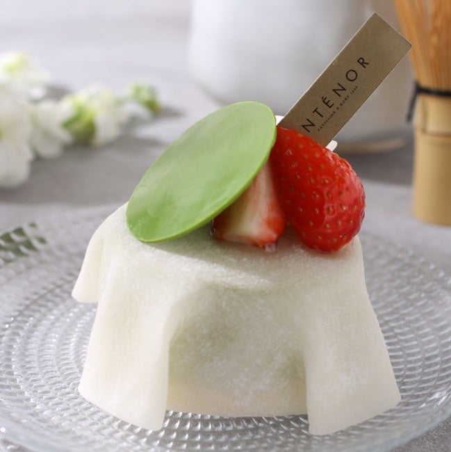 北川半兵衞商店の宇治抹茶「京の鶯」を使用。もちっとしたぎゅうひで抹茶のムースと抹茶のクリームブリュレ、甘酸っぱい苺のコンフィチュールを包みました。