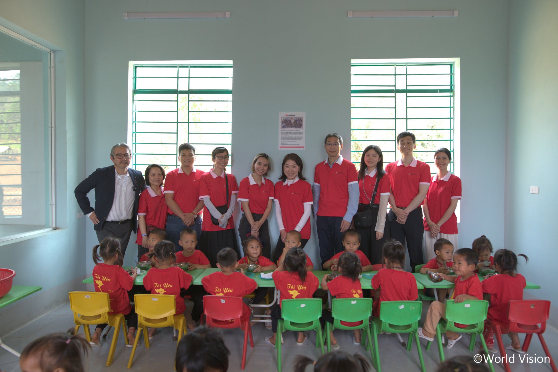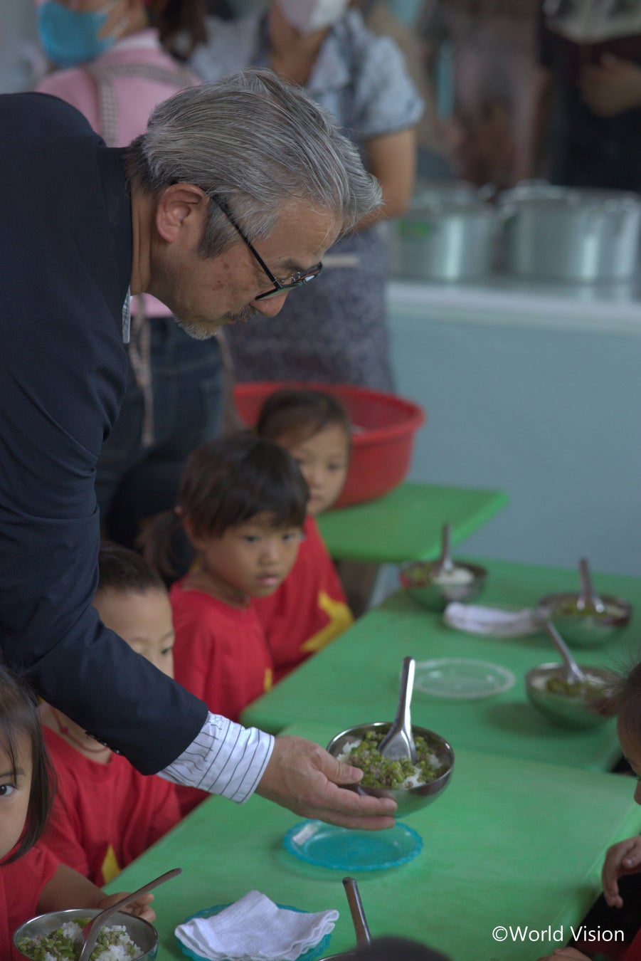 4月11日に行われた給食調理施設の引き渡し式には、園児や幼稚園の教員、調理スタッフ、保護者、コミュニティ関係者の他、ベトナム政府関係者、WVJとワールド・ビジョン・ベトナムのスタッフ、さらに森永乳業グループより11名が参加し、引き渡し式内では、当社取締役 常務執行役員 海外事業本部長 柳田隆宏より「当社海外事業の重要国ベトナムにおいて、当プロジェクトを通じ子供たちの心と体の健康を促進し、笑顔あふれる社会と輝く未来につなげていきたい」と、当プロジェクトの思いと関係者への感謝の意を述べました。引き渡し式では、園に通う子どもたちと新たにできた給食施設内での給食の提供を通じて交流を行いました。出席したコミューン長Lo Van Toi氏からは「郡内の子供たちとコミュニティのウェルビーイングのためにご支援いただき、心より感謝する」と喜びと感謝のお言葉をいただき、沢山の笑顔が見られました。