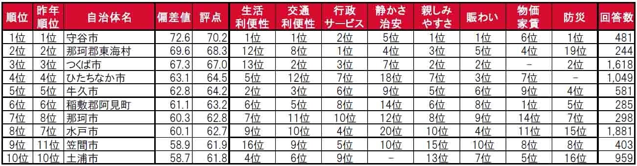 住みここち1位は6年連続で守谷市。2位と3位は5年連続で那珂郡東海村、つくば市。