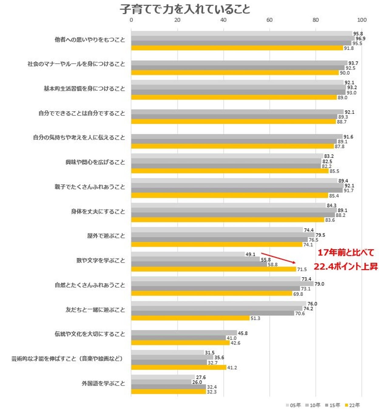 ※「社会のマナーやルールを身につけること」「自分でできることは自分ですること」「自分の気持ちや考えを人に伝えること」「伝統や文化を大切にすること」は2015年からたずねている※2005年3月、2010年3月、2015年2~3月、2022年3月に、首都圏(東京都、神奈川県、千葉県、埼玉県)の1歳6か月~ 6歳就学前の乳幼児をもつ母親が対象。2005年3月2,258名、2010年3月2,839名、2015年2~3月3,287名、2022年3月3,410名が回答