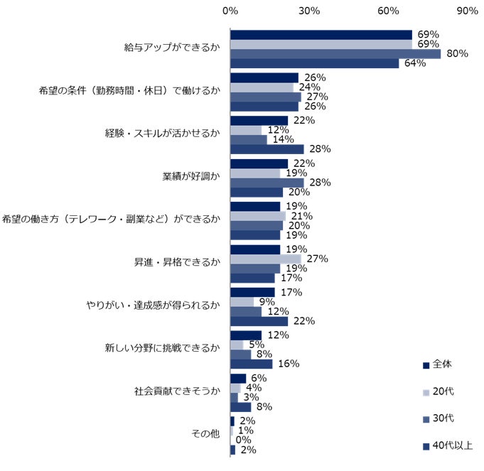 「物価上昇を受けて変化した」と回答した方に、より重視するようになった軸を聞くと、トップは「給与アップができるか」(69%)でした。年代別で見てもトップは共通でしたが、30代は80%と多数が該当しました(20代:69%、40代以上:64%)。