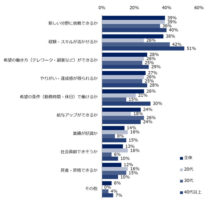“仕事選びの軸”を質問すると、上位3位は「希望の条件(勤務時間・休日)で働けるか」(54%)、「給与アップができるか」(50%)、「経験・スキルが活かせるか」(48%)でした。年代別で見ると、20代のみ上位3位に「希望の働き方(テレワーク・副業など)ができるか」(43%)がランクインしました。