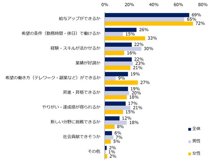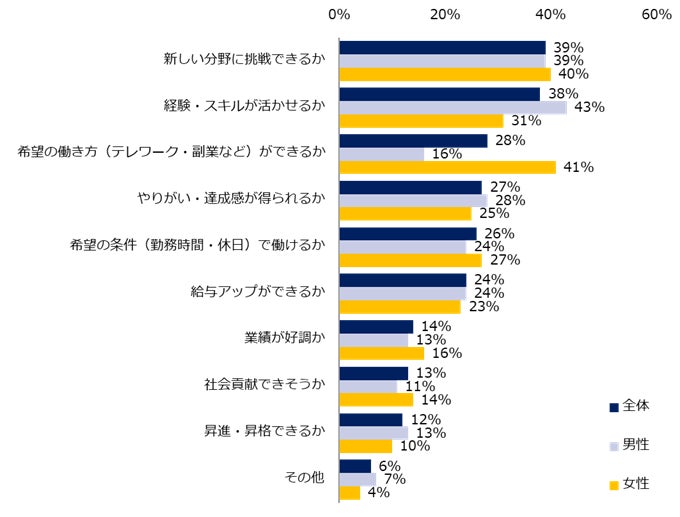 男女別では、男性は「経験・スキルが活かせるか」(52%)、女性は「希望の条件(勤務時間・休日)で働けるか」(64%)がそれぞれ最多になりました。それぞれ重視する理由も紹介します。