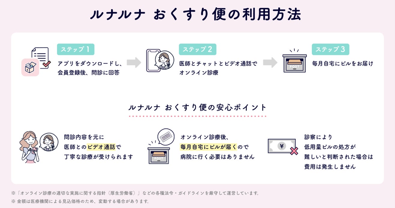 ※1:『ルナルナ おくすり便』は、医療機関とユーザーとの間でのオンライン診療を実現するプラットフォームです。実際の診療・薬剤の処方と発送は医療機関および医師が行います。診察の結果によっては、ピルの処方を受けられない場合や、おまとめプランを選択いただけない場合があります。