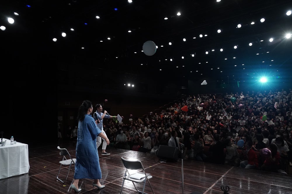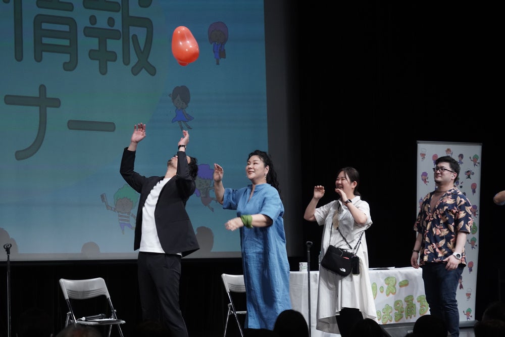 会場の皆さんと一緒にエクササイズをしながら風船運びゲームを実施。カラフルな風船で会場はさらに華やかに。