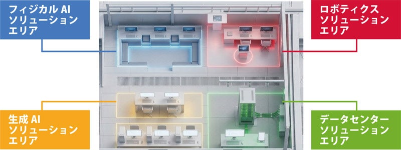 会場内の展示エリアでは、「フィジカルAIソリューション」「ロボティクスソリューション」「生成AIソリューション」「データセンターソリューション」の4つのテーマブースを設置し、NVIDIAをはじめとしたパートナー各社と連携したデモ展示を行います。