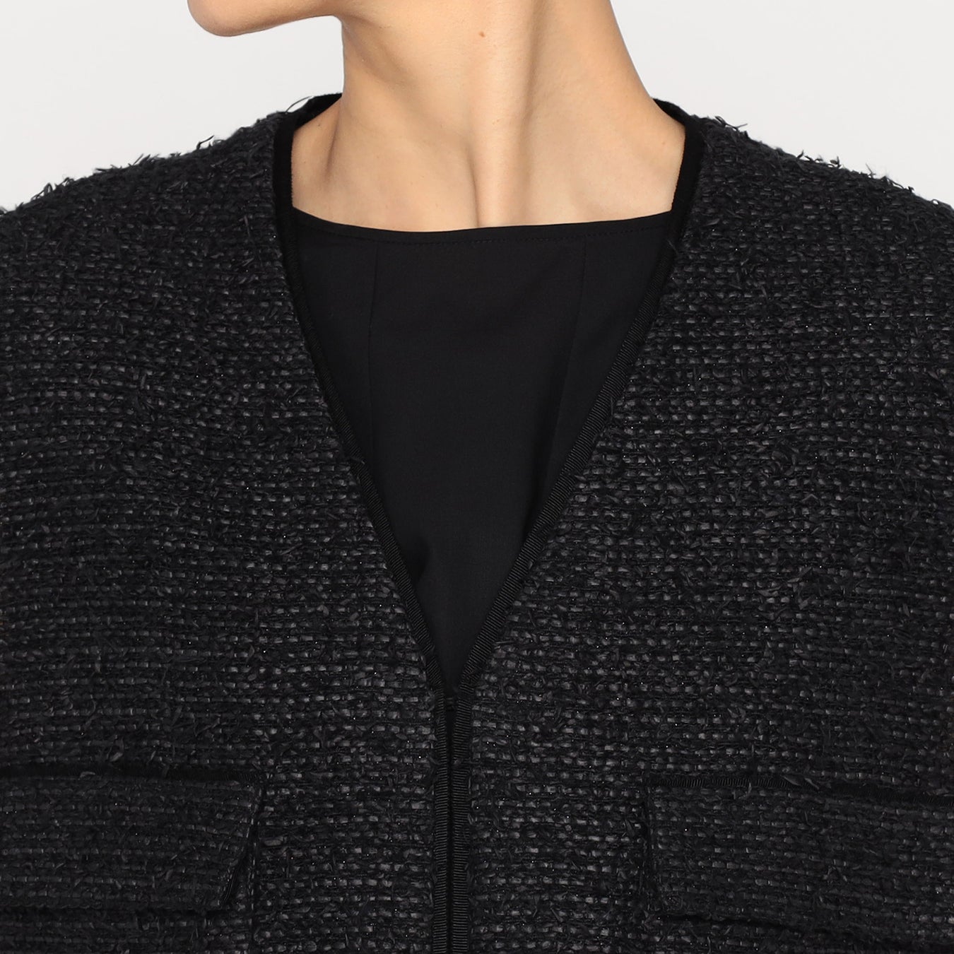 バジーレ28ならではのツイードとは何かを追求し、和紙を使用した春のツイードをつくりました。軽やかさと華やぎを兼ね備え、ブラックで仕上げた和紙カラミ素材です。