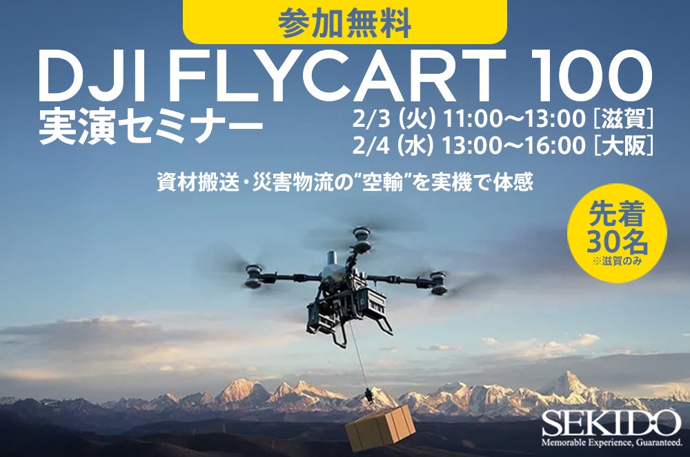 DJI(ディージェイアイ)正規販売代理店としてドローンビジネスの最前線を支える株式会社セキド(本社:東京都港区、代表取締役:大下貴之、以下「セキド」)は、東洋エンジニア株式会社(本社:滋賀県大津市、代表取締役:荒川昇)、深空株式会社(本社:大阪府大阪市、代表取締役社長:LIU WENHUI)と共催で、大型物流ドローンを無料で体感できる「DJI FLYCART 100 実演セミナー」を、2026年2月3日(火)に滋賀県守山市、2月4日(水)に大阪府枚方市で開催します。