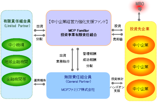 - MCPファミリア株式会社はMCPパートナーズ株式会社の100%子会社です。本ファンドでは比較的小規模な中小企業を対象にMBOによる出口戦略やマイノリティ出資等を通じて、事業承継課題の解決を図ります。