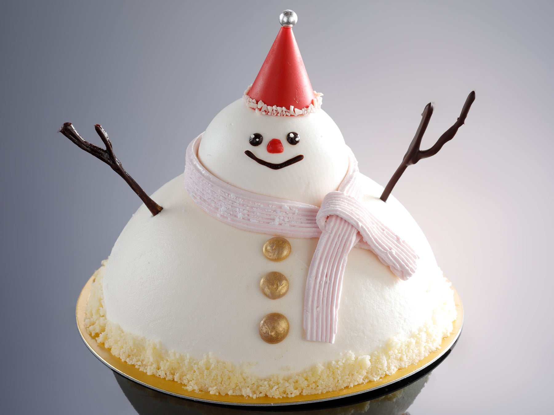 チーズクリームで覆った雪だるまの上段はベリーのジュレとムースを入れた甘酸っぱいケーキ、下段はいちごやマスカットなどのフルーツを入れた、華やかな断面のズコットケーキです。