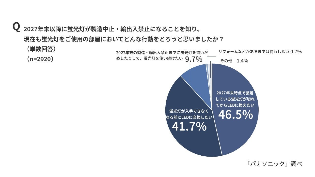 現在も蛍光灯を使用している部屋でどんな行動をとるかを聞いたところ、「2027年末時点で装着している蛍光灯が切れてからLEDに換えたい」が最多の46.5%、次いで「蛍光灯が入手できなくなる前に、LEDに交換したい」が41.7%となり、大半の人がLED照明に切り替えをする意向を示しています。