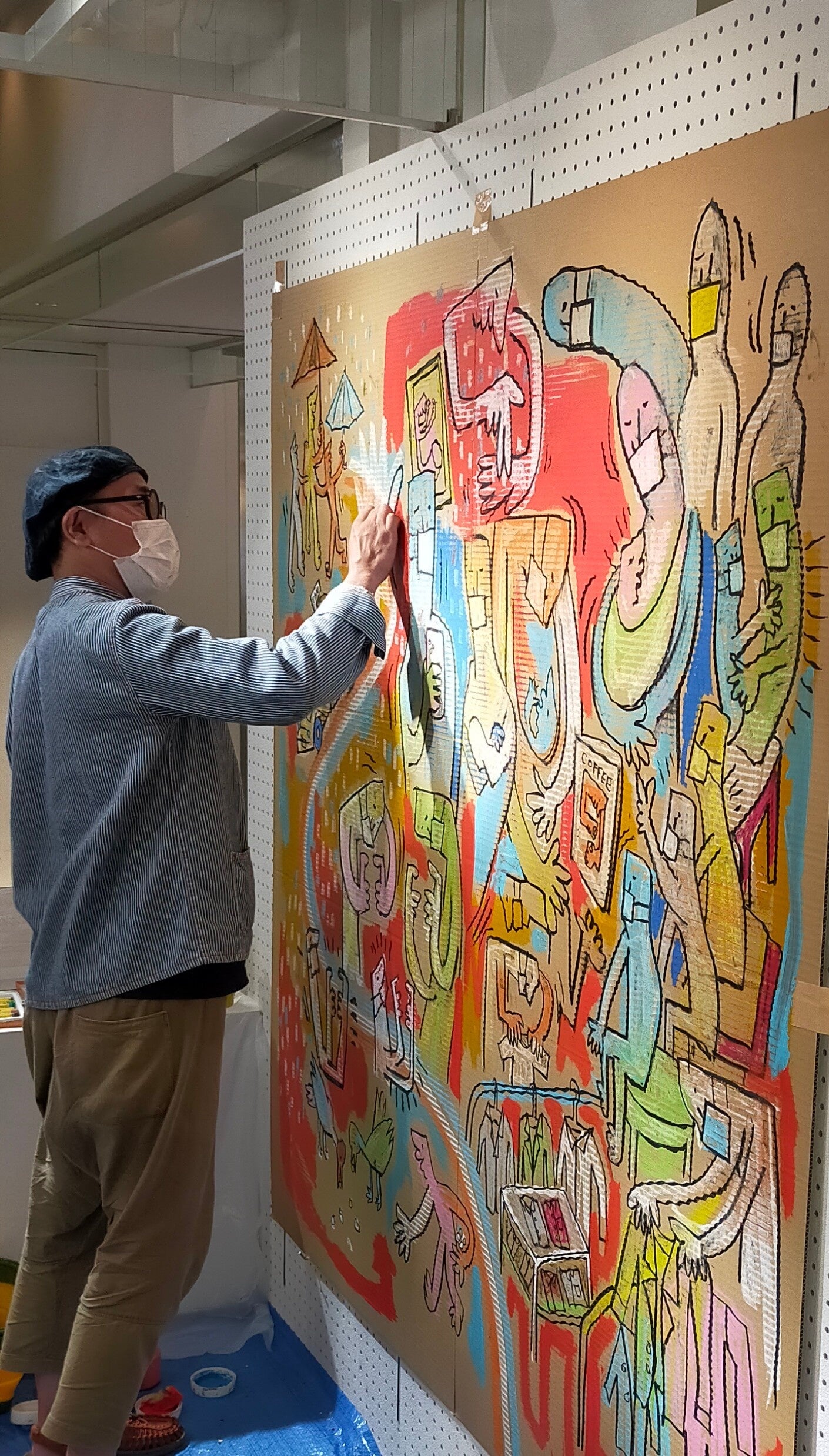 西武池袋本店とそごう千葉店では、門秀彦さんご本人によるライブペインティングを開催。1つの作品を週ごとに描きあげていきます。さらに、そごう千葉店では会場にお越し頂いたお子さま達が描いた絵をライブペインティングの作品に貼り付けて完成させるワークショップも開催いたします。
