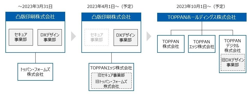 | 2023年10月(予定) | 持株会社体制へと移行し、持株会社「TOPPANホールディングス株式会社」として、グループ全体最適の視点から事業会社を一体的に運営、持株会社の傘下には、「TOPPANエッジ株式会社」、並びに、凸版印刷の主要部門を母体とする「TOPPAN」及びトッパングループ全体でのDX事業推進を牽引する「TOPPANデジタル」を設立。 |