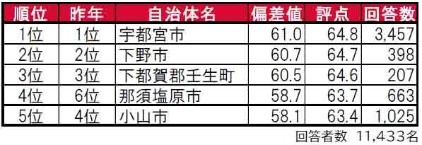 住みここちトップ3は2年連続で1位宇都宮市、2位下野市、3位下都賀郡壬生町。