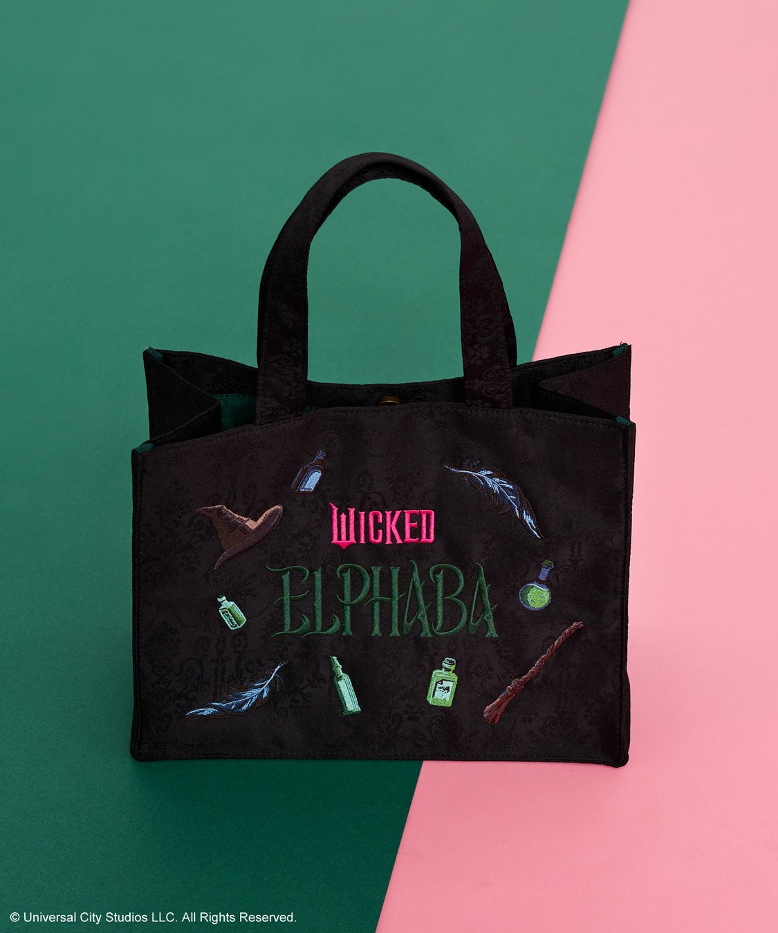 エルファバを表現したアイテムには、重厚感のあるジャカード素材を採用。ポーチにはアンティークゴールドのプリントでグリンダと対になるシルエットを配し、トートバッグにはほうきや帽子、羽といった象徴的なモチーフを刺繍しました。また、バッグとポーチの内側には、エルファバを象徴するグリーンのサテン生地を使用し、シックな外観とのコントラストを演出しました。
