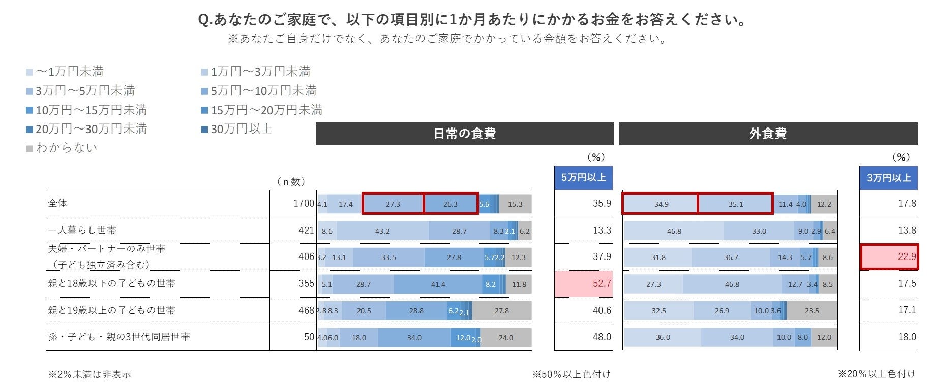 日常の食費で、全体で最も割合が高いのは「3万円~5万円未満」で27.3%、次いで「5万円~10万円未満」が26.3%という結果でした。