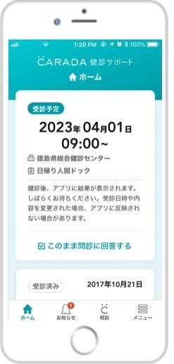 株式会社エムティーアイが運営する、健診機関と受診者のコミュニケーションをサポートするトータルパッケージ『CARADA健診サポートパック』が、徳島県では初となる公益財団法人とくしま未来健康づくり機構(以下、「とくしま未来健康づくり機構」)へ導入され、健康診断結果を閲覧できる受診者専用アプリ『CARADA健診サポート』の提供を4月より開始します。