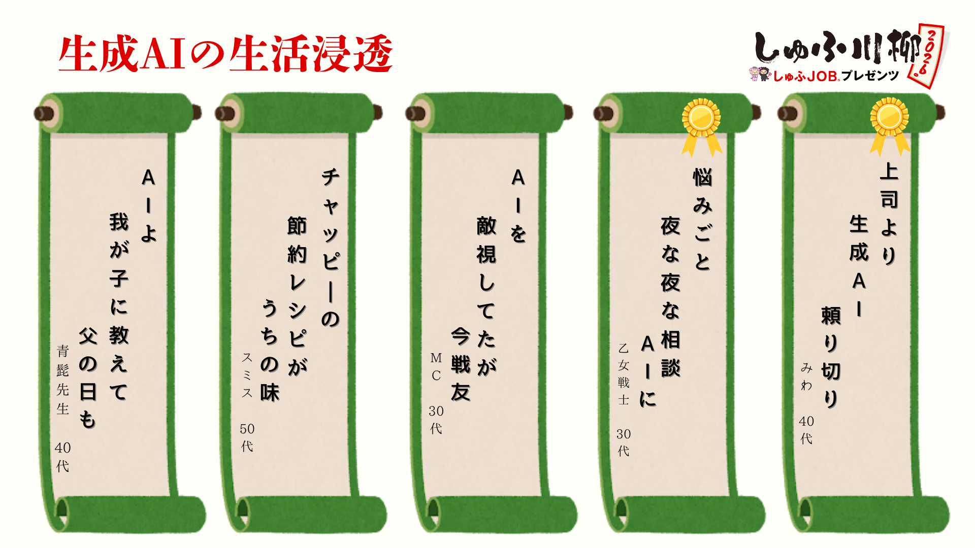 投稿作品の中で目立ったのが、生成AIの生活への浸透です。献立の相談や日常の悩みごとなど、生成AIを身近な相談相手として活用する様子がうかがえました。