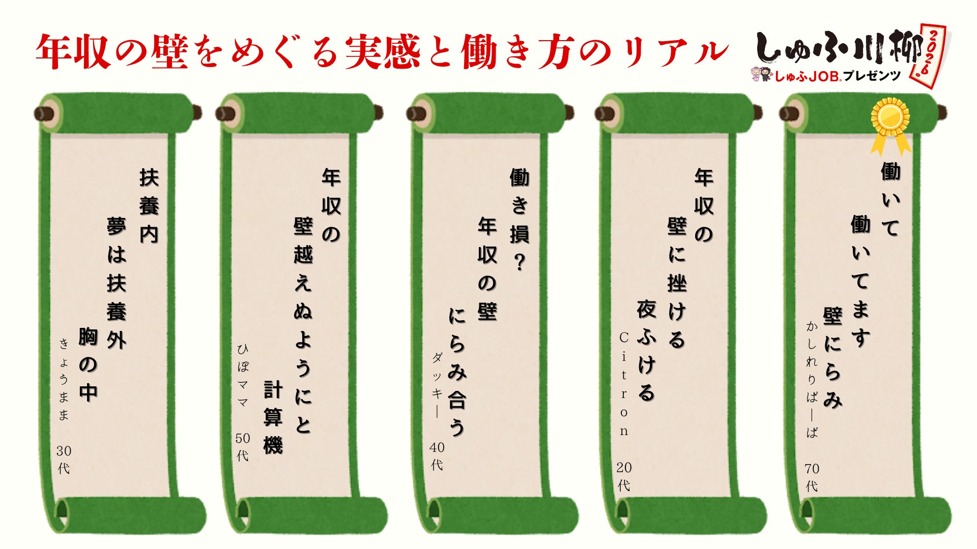 2026年4月から年収130万円の判定基準が変更されるなど、制度の見直しが進む中、年収の壁をめぐるテーマは今回も多くの投稿が寄せられました。川柳には、収入を増やしたい一方で制度上の制約を意識しながら働く様子や、働き損への戸惑い、シフトや収入を細かく調整する日常の実感が描かれています。