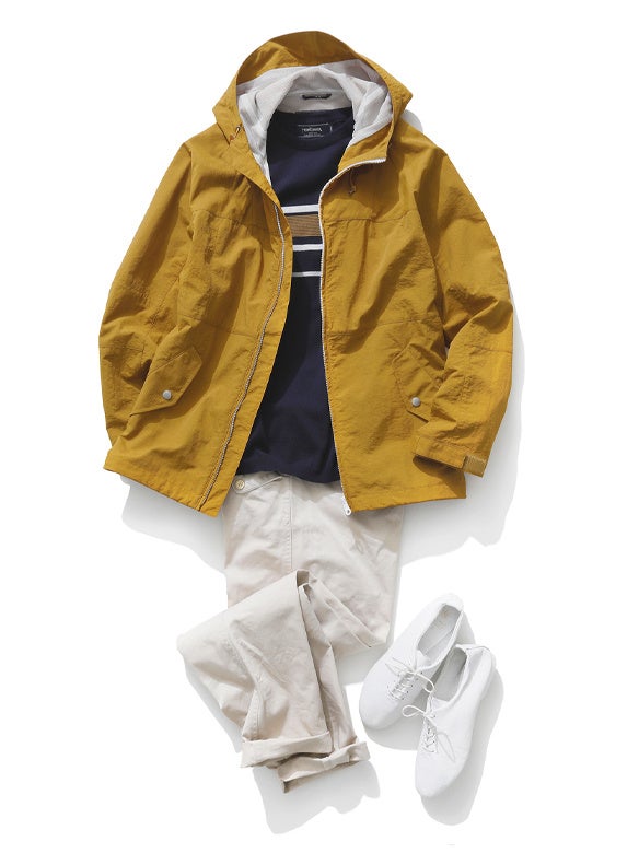 優しいイエローオーカーのマリンパーカには、カラーをリンクさせたボーダーニットソーを合わせることで、リラックスしたフレンチ&マリンテイスト薫る休日スタイルが完成します。