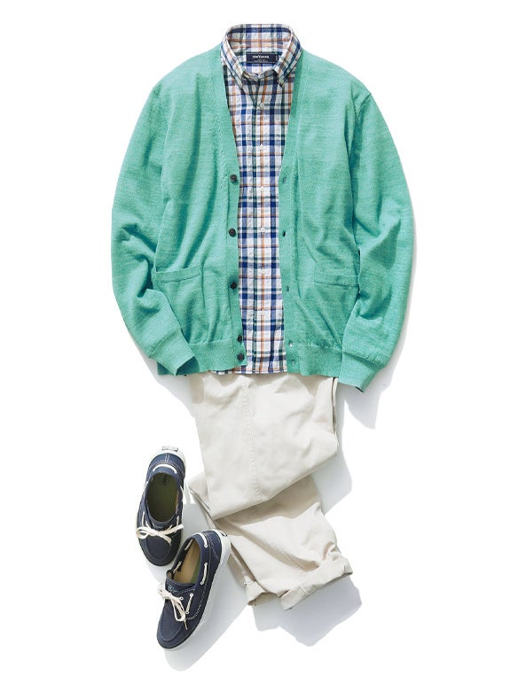 適度にリラックス感のあるマリンパンツには、ジャストサイズのカーディガンを合わせてメリハリのあるスタイリングに。鮮やかな色遣いは気分を高揚させます。