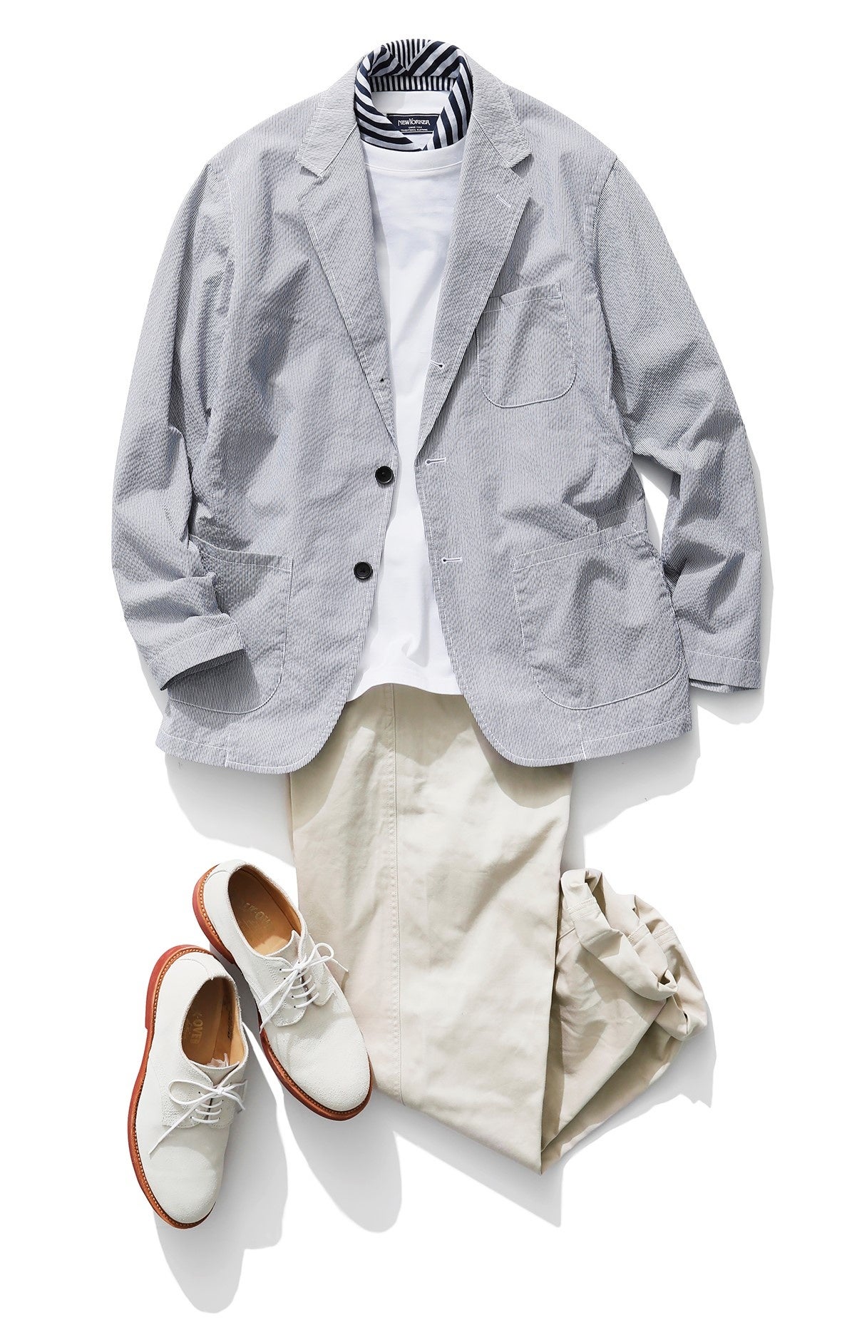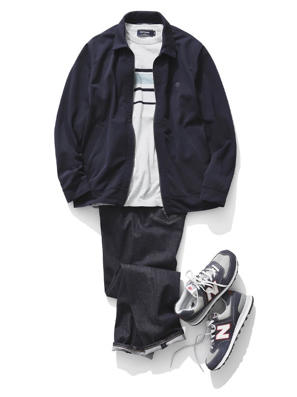 さわやかな印象のブルー×ホワイトでまとめたマリンスタイル。コードレーンジャケットやホワイトカットソーなど軽快なアイテムをチョイスして、一足早く夏の装いを愉しんでみては?