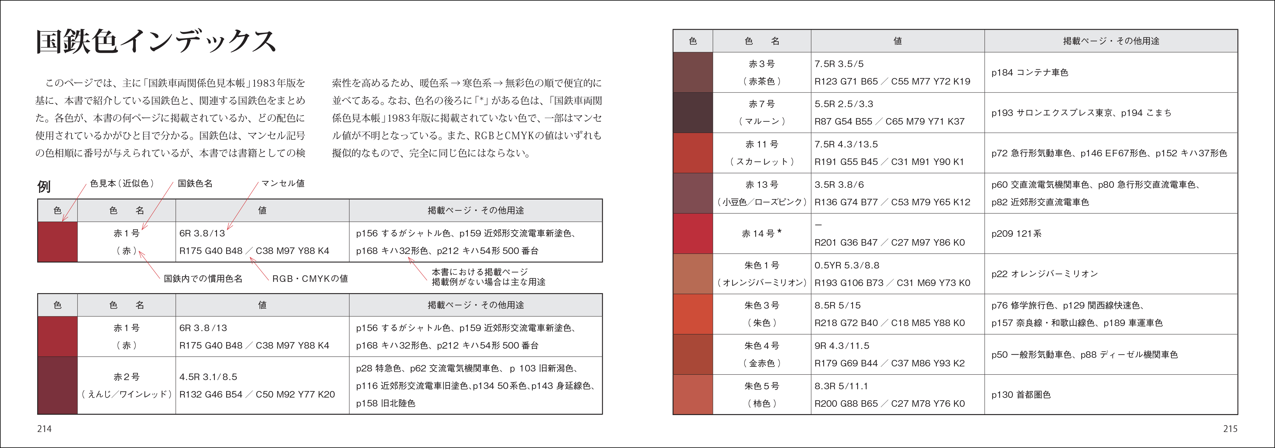 そして特筆すべきは、各国鉄色が数値化されていることでしょう。「国鉄車両関係色見本帳」には色の表示記号であるマンセル値が記載されています。その数値を元に、現在、コンピューターや印刷の世界で広く使われているRGBとCMYKで表現できるデータも参考値として併記されているのです。