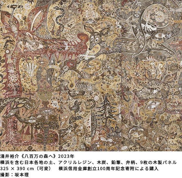 本作品は、2023年度、横浜信用金庫様より創立100周年記念事業として横浜市文化基金に寄せられた寄附金を財源に、横浜市が淺井裕介氏に作品の制作を委嘱し、新たに横浜美術館コレクションに加わったものです。画材として主に横浜市内の土が用いられ、多くの人や場所との交流が生まれた本作品を、この機会にぜひご覧ください。