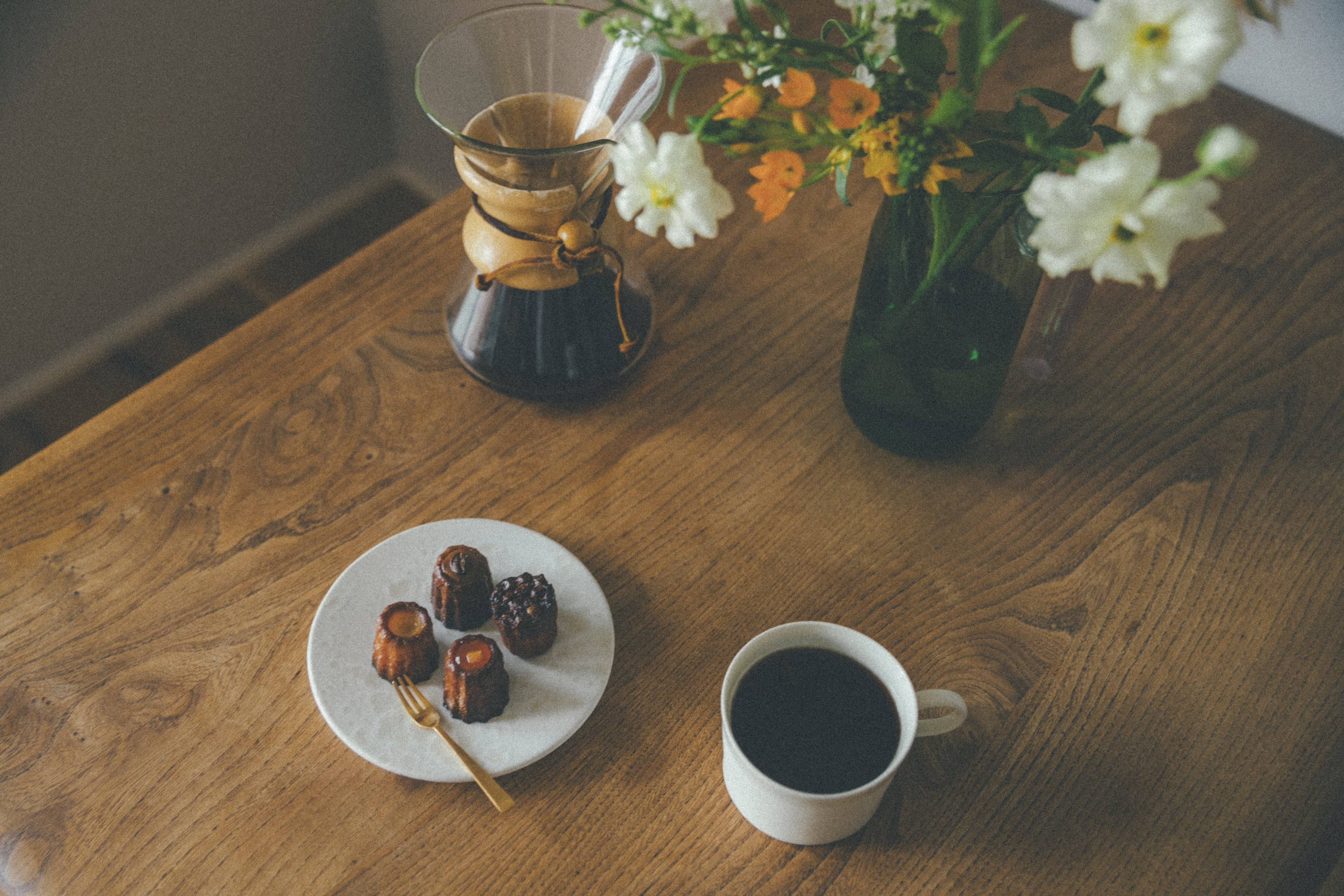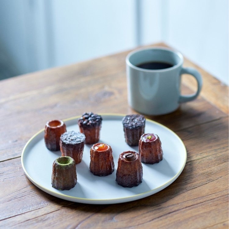 季節ごとに楽しめる味がアソートされた人気のカヌレSET。定番の“しろ”に加え、珈琲・ほうじ茶・すもも・抹茶あんこ・とうもろこし・黒糖くるみ・あんずの8種類がラインアップ。珈琲味は、今回のために特別にアソート。4種SETは、しろ・珈琲・黒糖くるみ・あんずのフレーバーです。