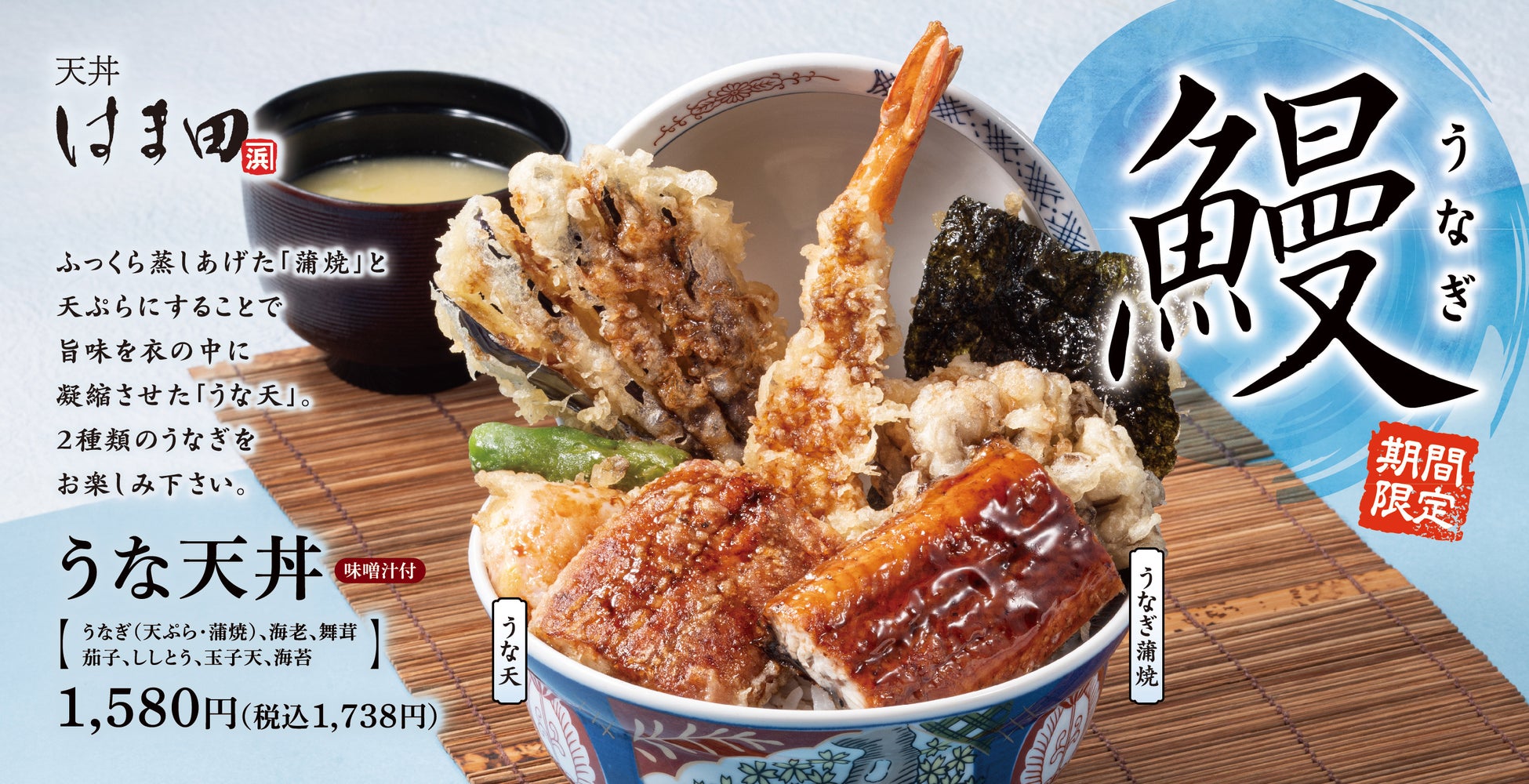 ■うな天丼 味噌汁付 1,580円(税込1,738円)