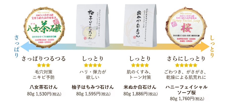 美容洗顔用石けんは、全4種類。毛穴対策やニキビ予防をしたい方には「八女茶石けん」、肌のハリ・弾力を保ちたい方は「柚子はちみつ石けん」、肌のくすみやトーンが気になる方は「米ぬか白石けん」、よりしっとしたうるおいが欲しい方には「ハニーフェイシャルソープ桜」を。お好みでお選びください。