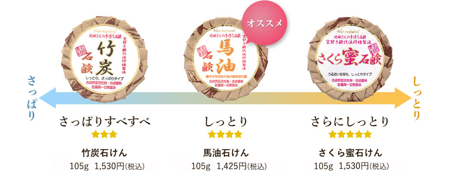 毛穴の汚れが気になる方は「竹炭石けん」、乾燥にお悩みの方は「さくら蜜石けん」がおすすめです。