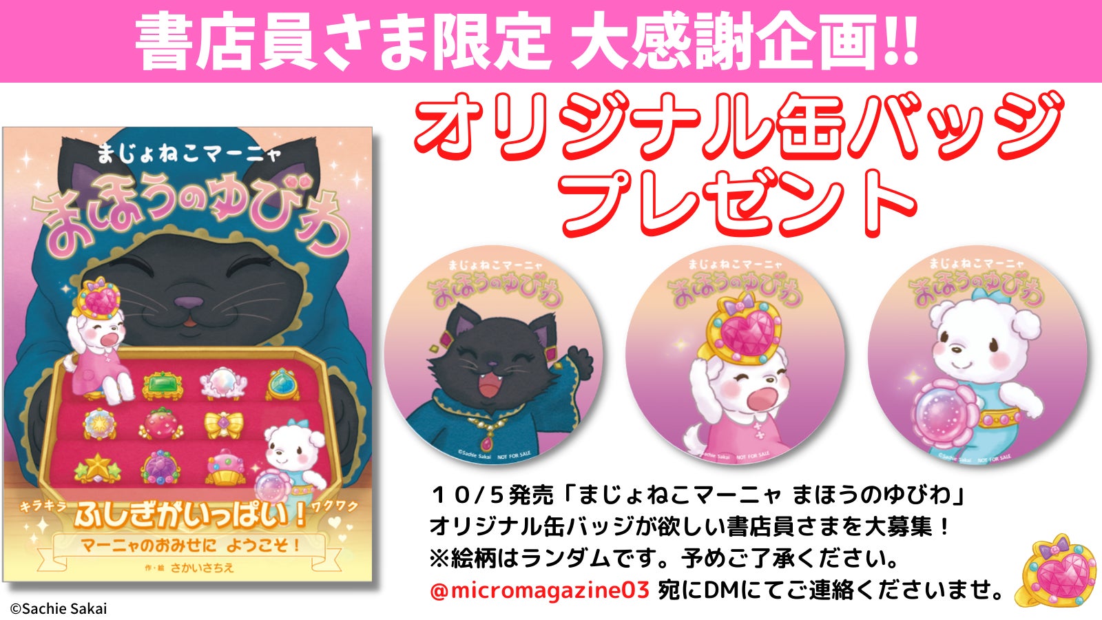 マイクロマガジン社(東京都中央区)は、全国の書店員さまへの大感謝企画として、絵本『まじょねこマーニャ まほうのゆびわ』オリジナル缶バッジをプレゼントいたします。