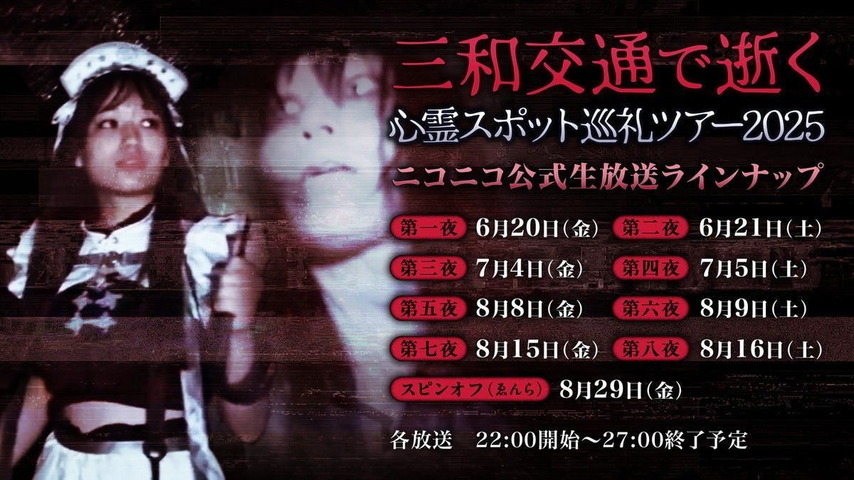 ニコニコ生放送にて、2025年6月21日(土)から9月6日(土)まで、毎年恒例・夏のホラー特集「ニコ生ホラー百物語2025」を配信いたします。ホラー映画特集や心霊スポット巡礼ツアーなどのホラー番組を配信予定。初日の6月21日(土)は「戦慄怪奇ワールド コワすぎ!」をニコ生初配信いたします。
