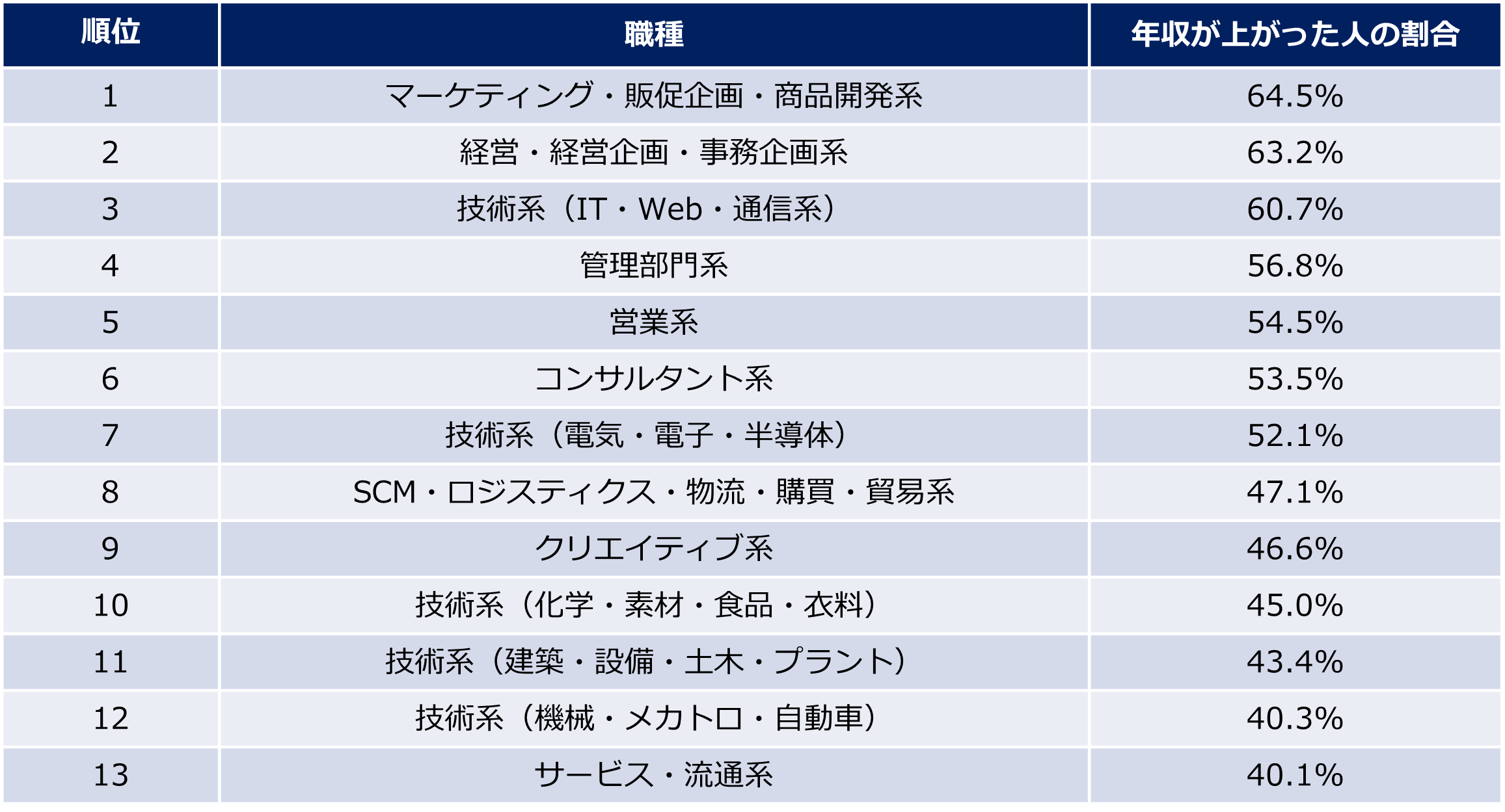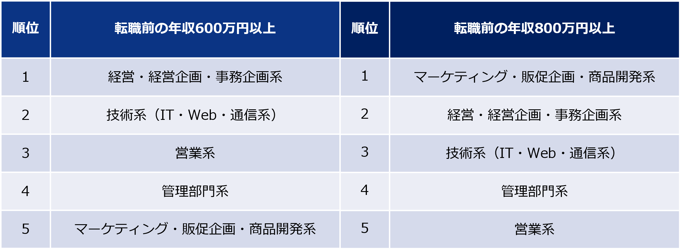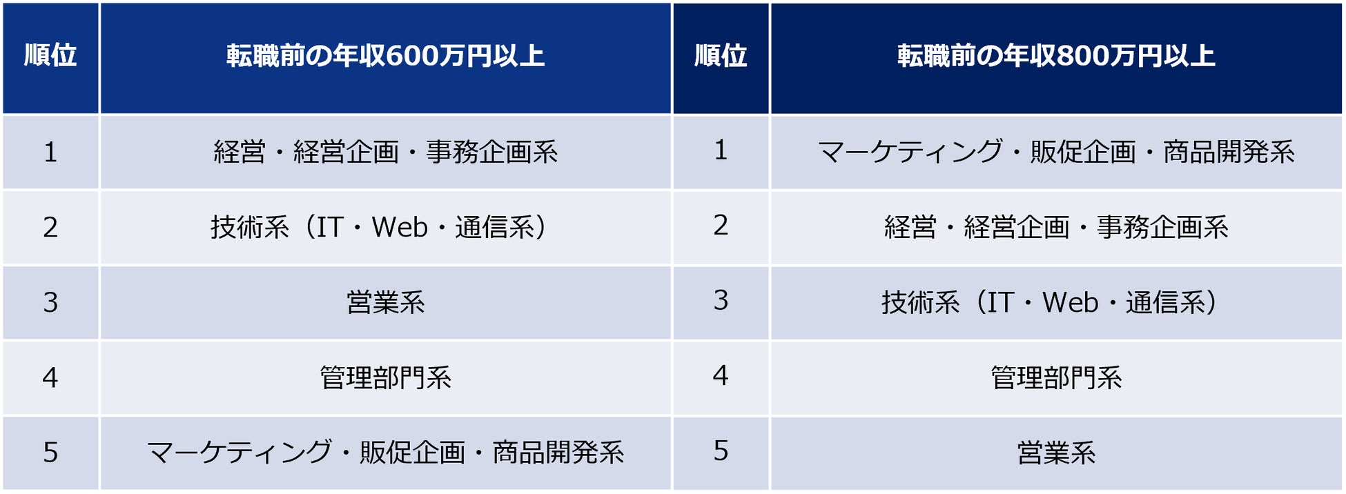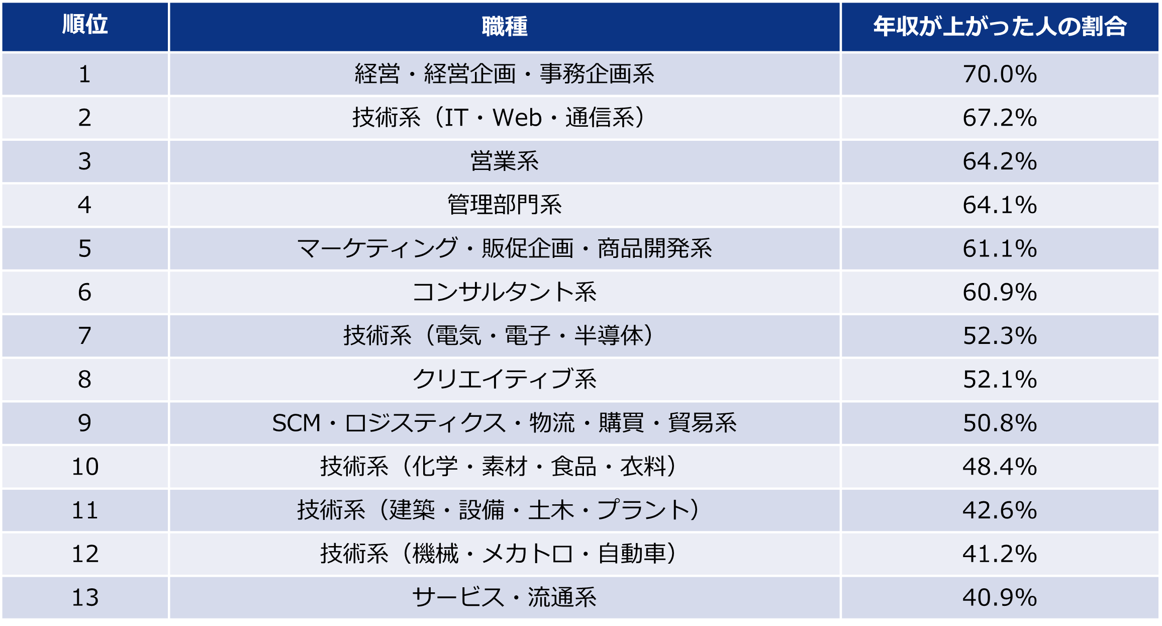 転職前年収600万円以上の層では、事業の根幹を支え、変革をリードする職種が上位を占めました。共通して、単なる実務能力だけでなく上流の戦略立案や課題解決を担える人材が高い評価を得て年収アップを実現しているものと考えられます。