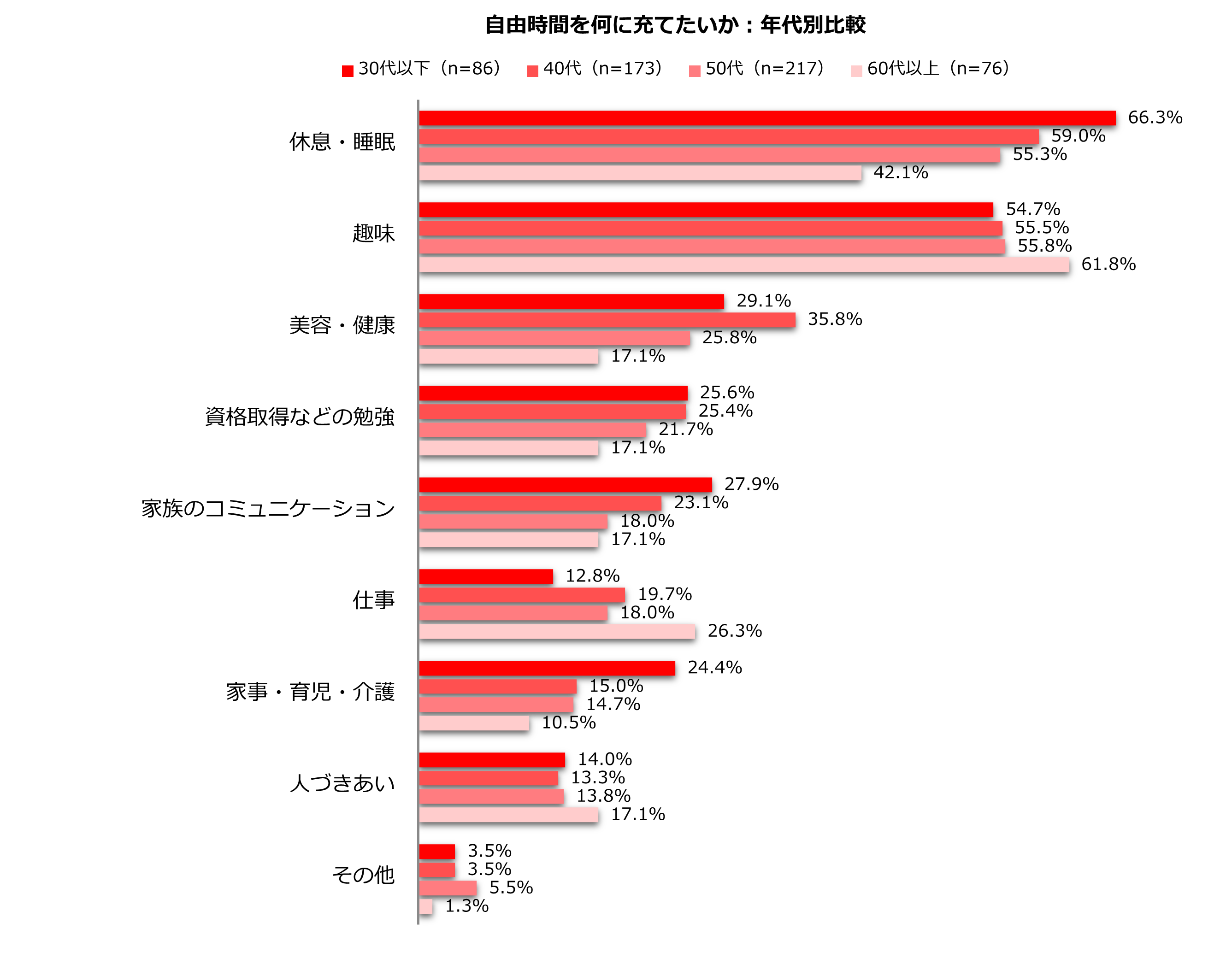 4.自由になれる時間を充てたいこと「休息・睡眠」「趣味」56.3%/年代別比較