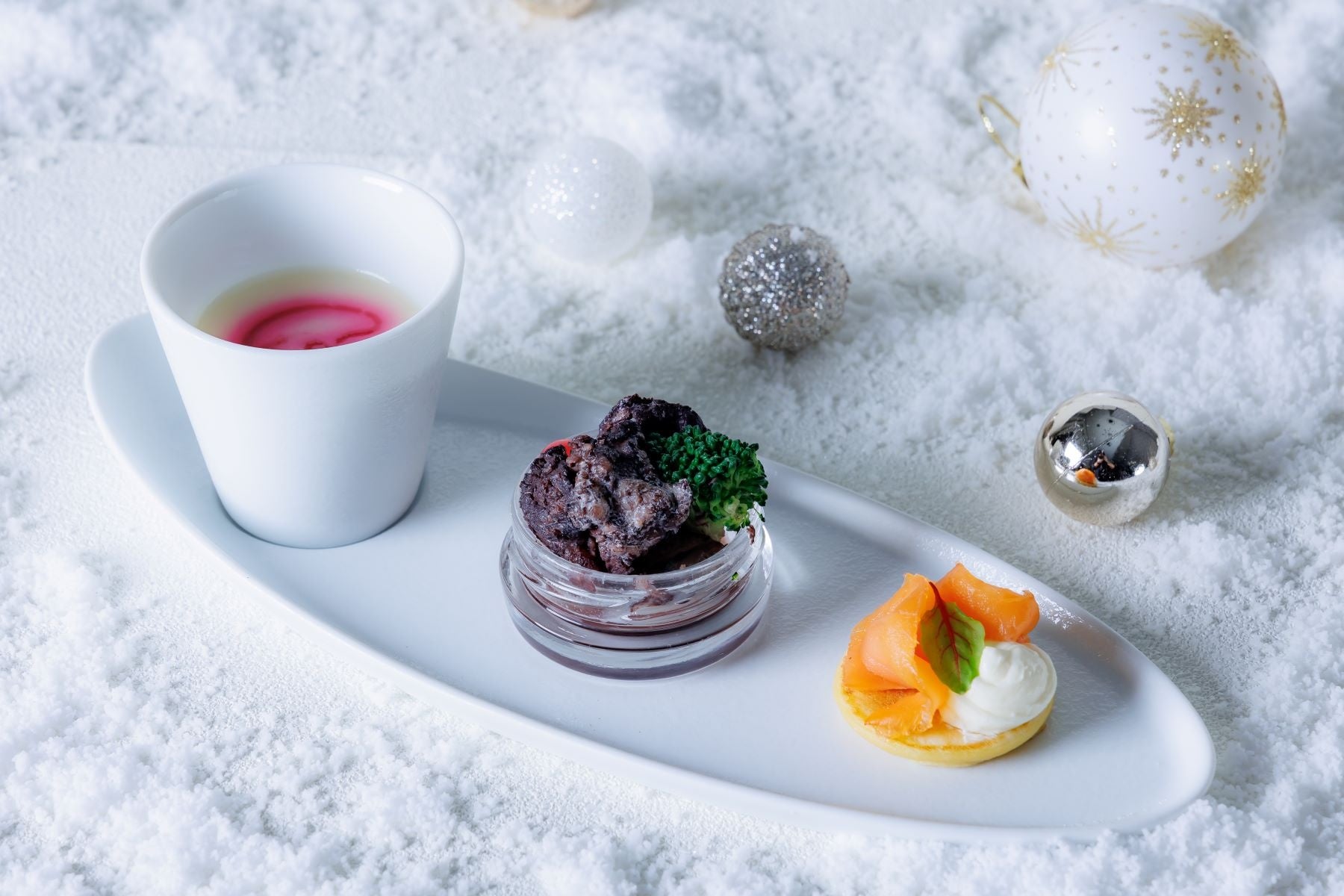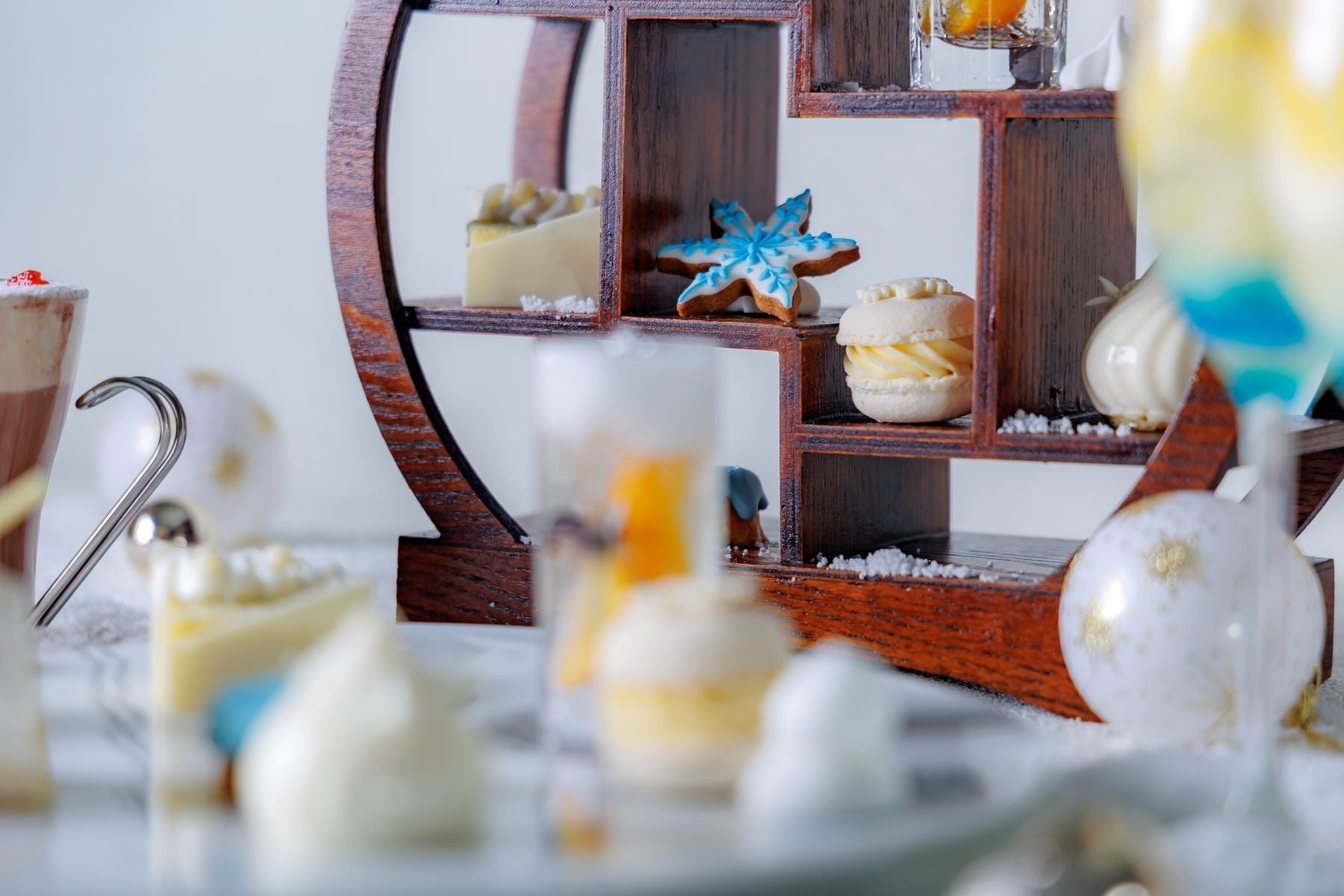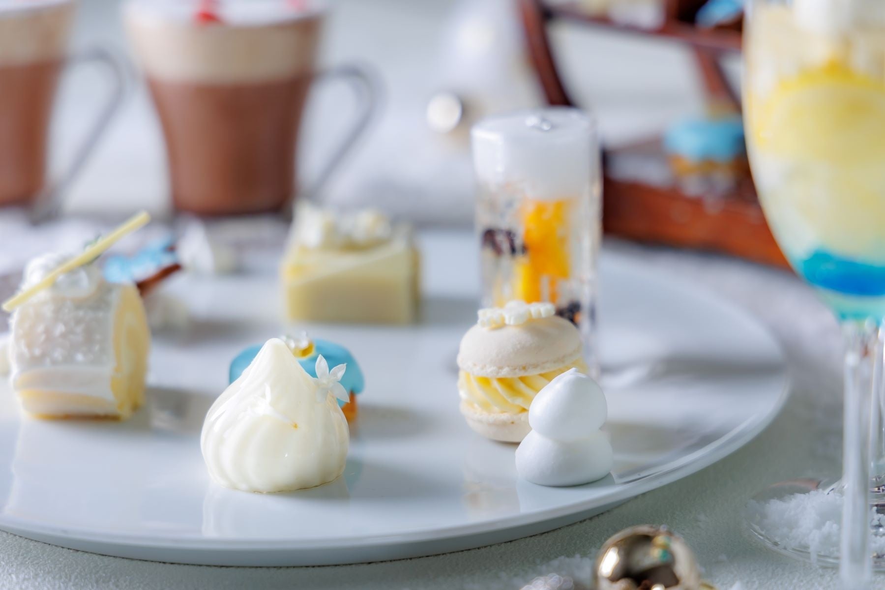 和と洋の食材を取り入れたスイーツ8種には、白ワインジュレに金柑のコンポートとブルーベリーを入れて雪に見立てた柚子の泡をプラスしたグラスデザートや、雪の結晶を描いたアイシングクッキー、みかんのジュレとヨーグルトで真っ白に仕上げたムース、バタークリームとガナッシュとライム果汁で仕上げたオペラ、雪が降り積もったように飾り付けしたホワイトロールケーキ、雪の結晶をあしらったバタークリームとラズベリージャムのマカロン、柚子ピールと和栗の渋皮煮とラム酒を加え深みのある大人な味わいのパウンドケーキなどをご用意。