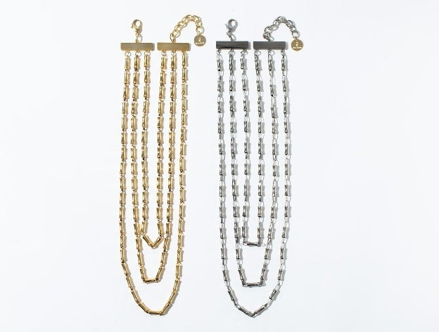 <バンブーモチーフをパイプ状に組み合わせたボリューミーながら上品なネックレス>