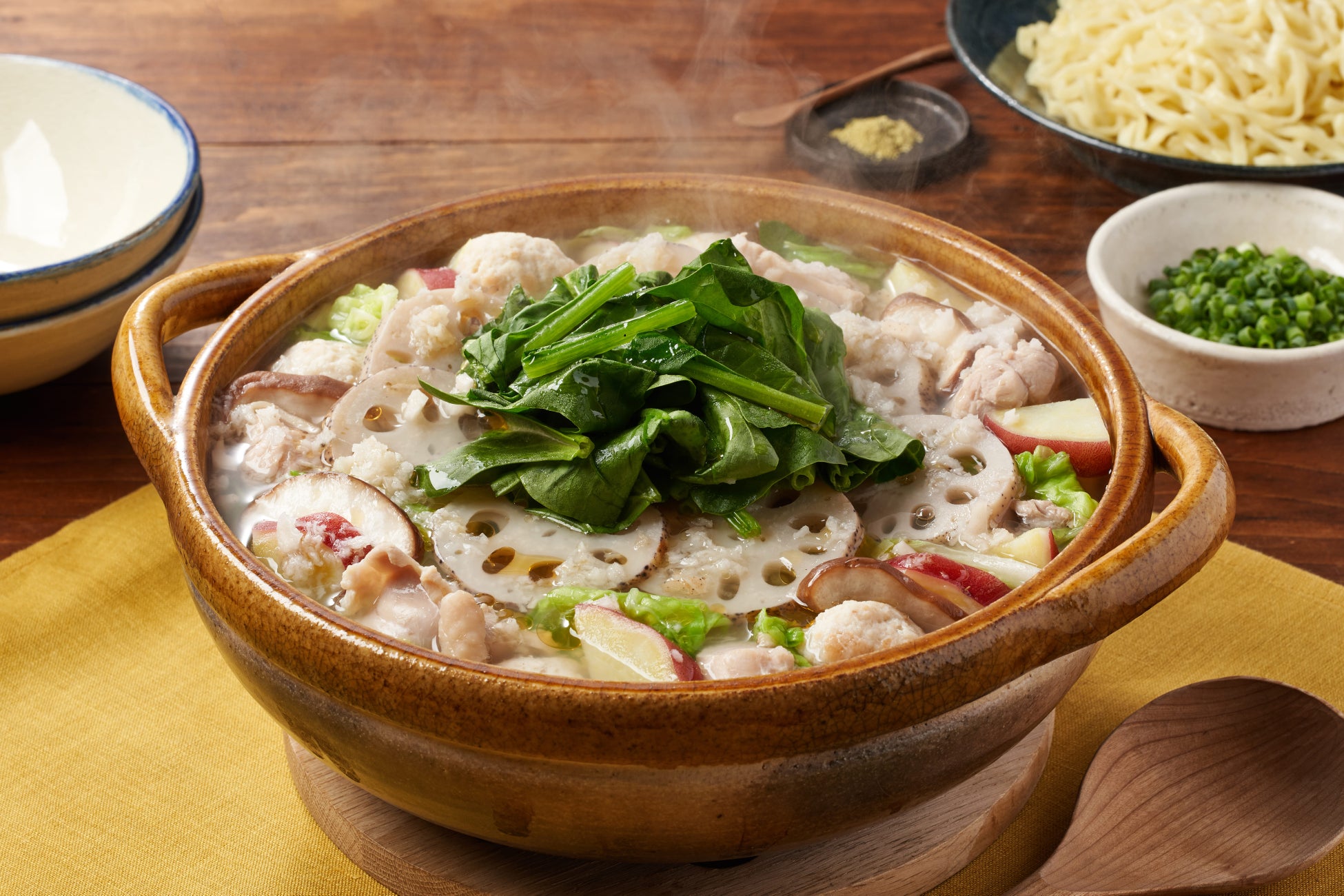 商品説明:蓮根がメインの鶏塩鍋です。すりおろした蓮根による程よいとろみと、スライスした蓮根のシャキシャキ感、2種類の食感を味わうことができ、「食感が楽しい」「満腹感がある」とご好評をいただいています。途中で山椒を加えて、豊かな香りと刺激をお楽しみください。〆は旨味が染み出たスープで作るラーメンで、最後の一滴まで味わえます。