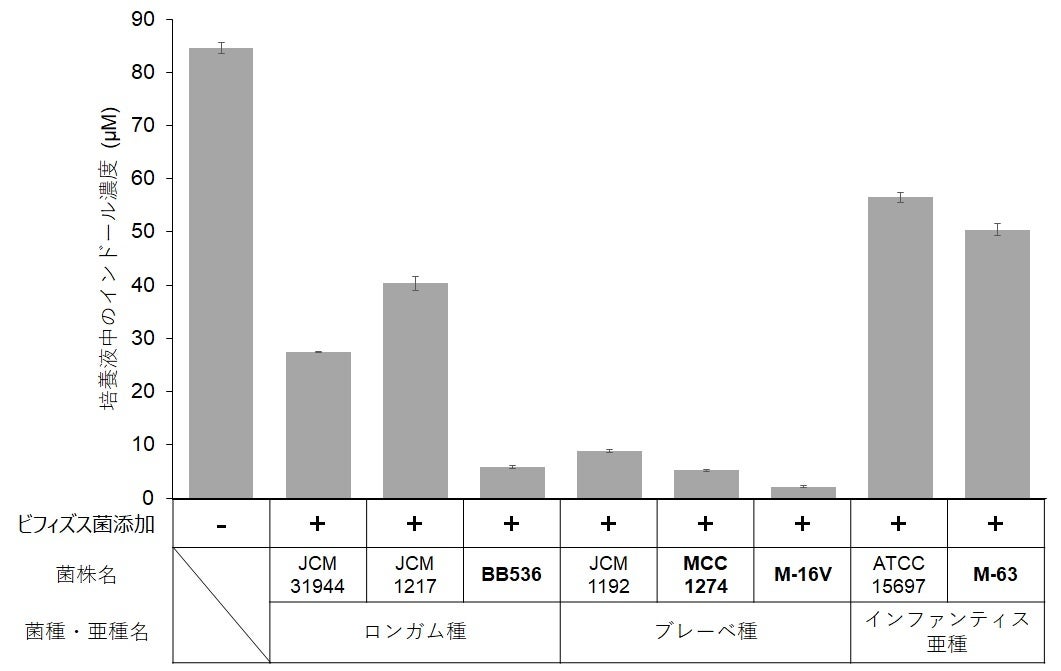 インドールを産生することが知られている大腸菌を培養し、この培養上清と様々なヒトにすむ種類のビフィズス菌を混ぜて培養したところ、大腸菌が産生したインドールの濃度を大幅に低下させるビフィズス菌が存在することが明らかとなりました(図1)。