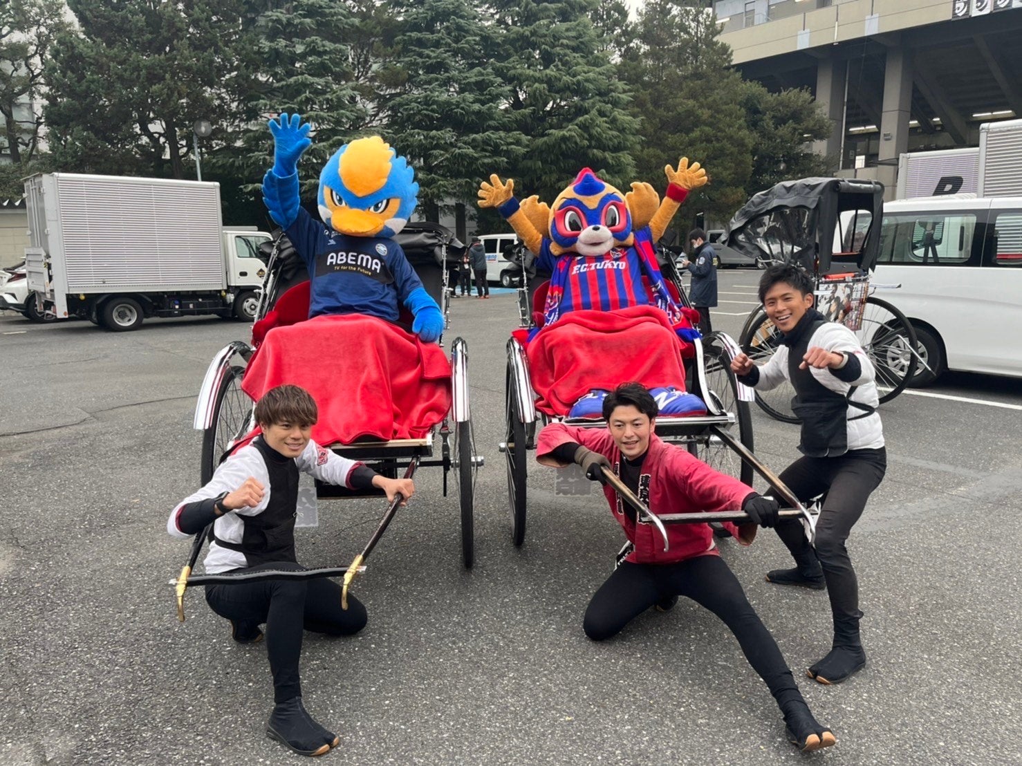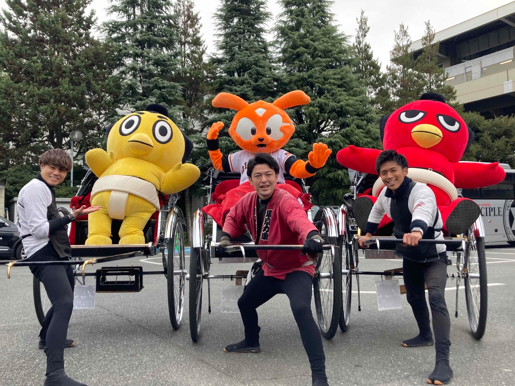 浅草を拠点に活動をしている現役俥夫ユニット”東京力車”が12月17日、秩父宮ラグビー場で行われた『リコーブラックラムズ東京vs 三菱重工相模原ダイナボアーズ戦』、国立代々木競技場第一体育館で行われた『アルバルク東京vs富山グラウジーズ戦』を盛り上げるべく登場した読売巨人軍のマスコット“ジャビット”ら他マスコットを人力車に乗せ、両会場を送迎した。