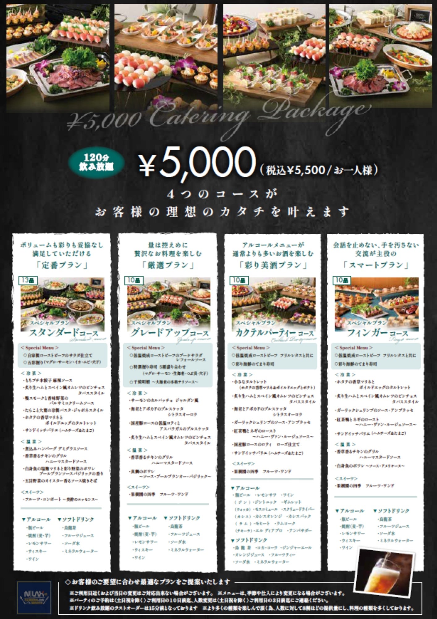 そのニラックスが運営する「ニラックスケータリング」は、事業拡大に伴う拠点移転を行い、増産体制を大幅に強化いたしました。これに合わせ、お客様の多様なニーズに応える「選べる4つの税込5,500円プラン(料理・飲み放題・備品込)」の販売を開始!