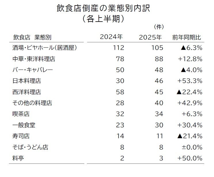 業態別にみると、居酒屋を主体とする「酒場・ビヤホール」が105件で最も多かった。前年同期(112件)から6.3%・7件減少したものの、2023年以降3年連続で100件を超える高水準での推移となった。町中華のほかラーメン店や焼肉店、カレー店などの業態が中心となる「中華・東洋料理店」(88件)は、前年同期(78件)から12.8%・10件増加し、過去最多だった。特に増加が目立つのは「日本料理店」(46件)で、前年同期(30件)から53.3%・16件の大幅増となり、上半期として初めて40件を超えて過去最多となった。団体客の減少や節約志向の高まり、経費削減による企業の接待需要の縮小などが逆風となった。こうした経営環境のなか、日本料理店では若年層の顧客取り込みを目的に価格を重視したメニューや、見た目にこだわった料理の開発を進めているものの、一方で古くからの常連客が徐々に離れるといった状況にも直面し、難しいかじ取りを迫られた。