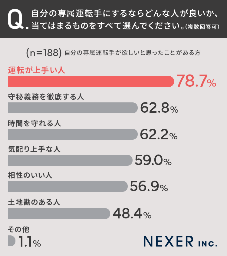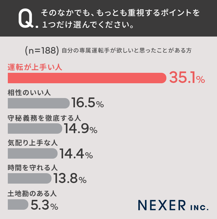 【専属運転手雇うなら...?】35.1%の方が、相性や守秘義務よりも「運転の上手さ」を重視