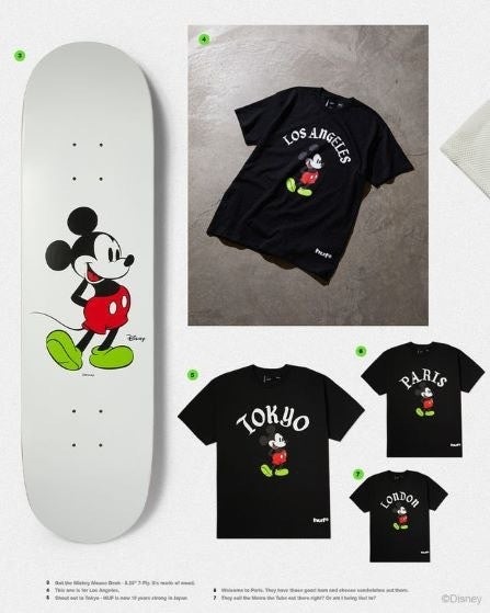 「Disney」を代表するキャラクター、ミッキーマウスの中で最も象徴的なアートワークをベースに世界10都市を表現したカスタムTシャツは、都市名を取り入れたタイポグラフィー、さりげないHUFロゴ、ミッキーのアイコニックな黄色いシューズがHUFを象徴するグリーンへアレンジされた“Green Shoe Mickey”として本コレクションを象徴します。