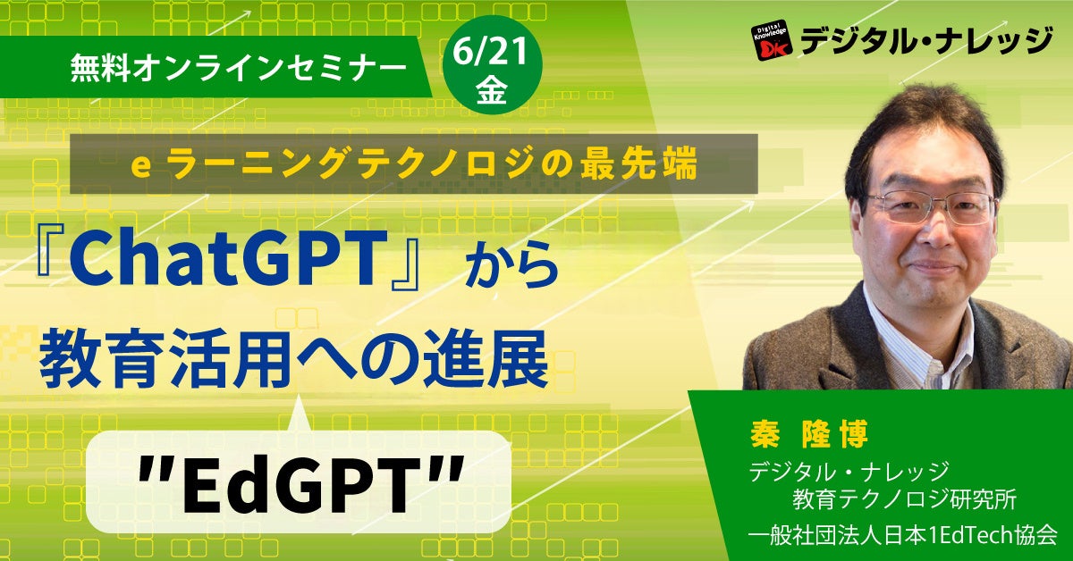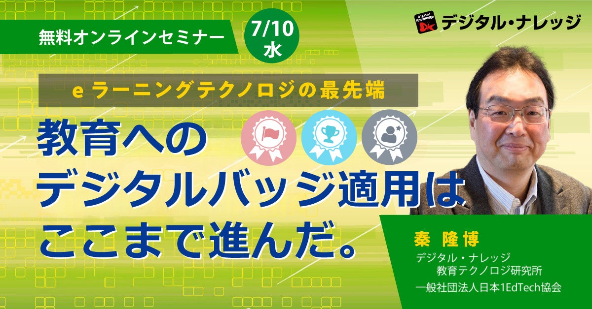 教育×最先端セミナーオンライン開催 7/10(水)「eラーニングテクノロジの最先端、教育へのデジタルバッジ適用はここまで進んだ。」 6/21(金)「生成AIの教育活用”EdGPT”への進展 初級編」