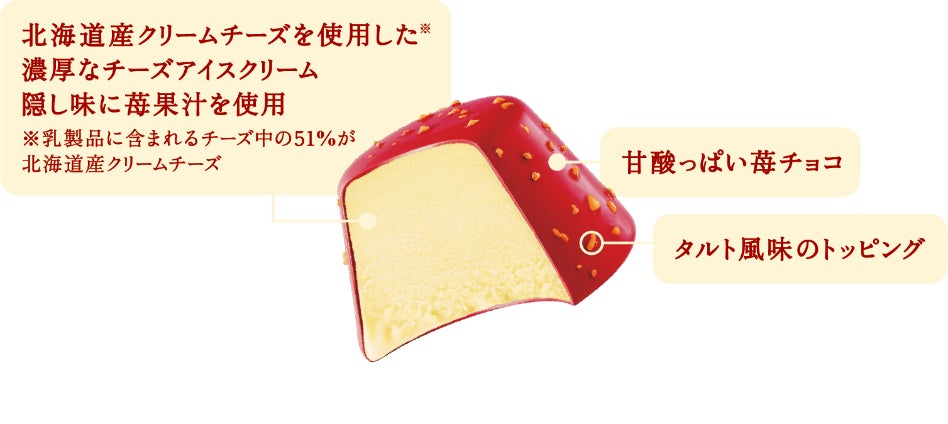 ①濃厚なチーズアイスクリームを、タルト風味のトッピングを混ぜ込んだ甘酸っぱいストロベリーチョコでコーティングした、ひとくちアイスです。