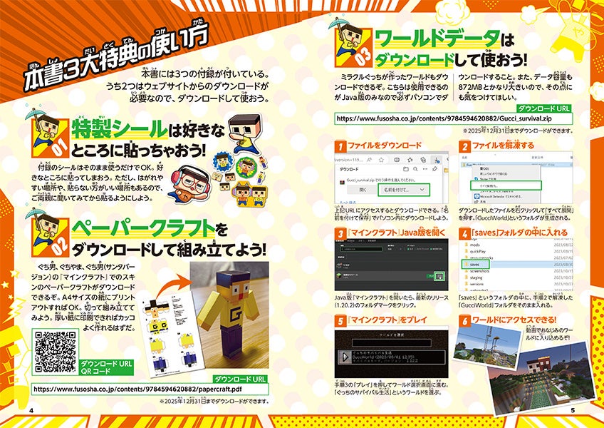 ぐち男のシールはもちろん、動画で見た建築物が入っているワールドデータ、自分で組み立て作るペーパークラフト、3つの特典が付いてくる!