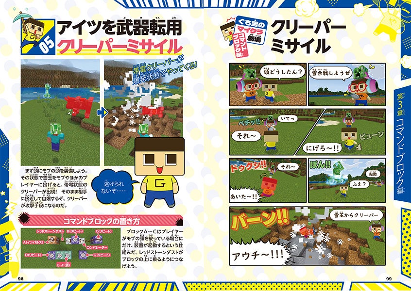 アイテムを出す」「モブを消す」といった便利なコマンド「クリーパーがミサイルになって飛んでいく」といった笑えるコマンドまで、超絶コマンドがキミのものに!